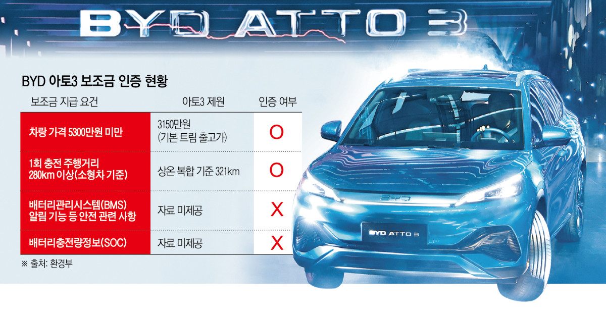 중국 최대 전기차 업체 비야디(BYD)가 국내 진출 후 처음 선보인 소형 전기 스포츠유틸리티차량(SUV) 아토3(ATTO3)의 전기차 보조금 확정이 지연되면서 소비자들의 불만이 이어지고 있다. 지난해 발생한 인천 주차장 전기차 화재를 계기로 올해부터 전기차 구매보조금 지급 시 배터리 안전 관련 항목이 세분화되면서 인증 절차가 늦어진 것으로 확인됐다.