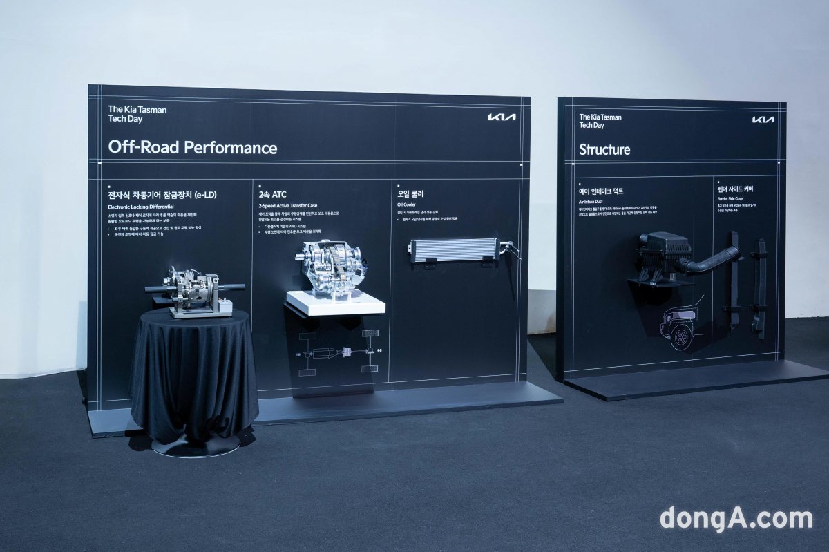기아는 이번 행사에서 ▲새로운 픽업 플랫폼 ▲도하 성능 ▲견고함과 활용성을 갖춘 적재 능력 등 정통 픽업의 특성을 구현하기 위해 적용된 차체 설계에 대해 설명했다. 또한 ▲2속 ATC ▲전자식 차동기어 잠금장치(e-LD) ▲전용 터레인 모드 등 우수한 오프로드 성능을 구현하기 위한 다양한 기술과 토잉 특화 기능을 선보였다. 타스만은 픽업 트럭 본질에 집중하면서도 SUV의 안락함을 갖춘 전천후 차량으로 개발됐다. 이를 위해 새로운 픽업 플랫폼을 적용했다. 두 개의 굵은 프레임이 크로스멤버로 연결된 형태의 ‘보디 온 프레임’ 구조가 그 비결이다. 이 구조는 사다리 모양의 강철 프레임에 파워트레인과 차체를 얹는 방식으로 일반 승용차 대비 무거운 하중을 더욱 잘 버틸 수 있다. 뛰어난 적재 능력과 높은 내구성, 뛰어난 험로 주행 성능을 구현하는 기반이 되는 셈이다. 또 252㎜의 높은 최저지상고를 확보해 주요 부품을 험로 주행 시 손상되지 않도록 했다. 지상고는 기아 대형 SUV 모하비보다 85mm 높다. 덕분에 접근각과 램프각, 이탈각을 최대치로 확보했다.