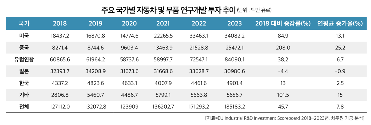 반면 중국 업체 중 1위를 차지한 BYD는 2023년 47억 2900만 유로를 연구개발비로 집행했다. 전년(25억 4730만 유로) 대비 85% 늘었다(차두원 전 현대차그룹 TaaS본부 상무 분석).