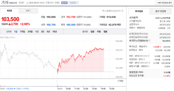 4일 100,700원으로 장을 시작하여 장중 100,500원의 저점을 기록한 후 상승 폭을 확대하며 고가 103,700원에 도달했다. 현재 주가는 고점에 근접한 수준을 유지하며 견조한 흐름을 나타내고 있다. 동일 업종은 1.48%의 등락률을 기록하고 있어, 기아는 업종 평균보다 높은 상승률을 보이는 모습이다.