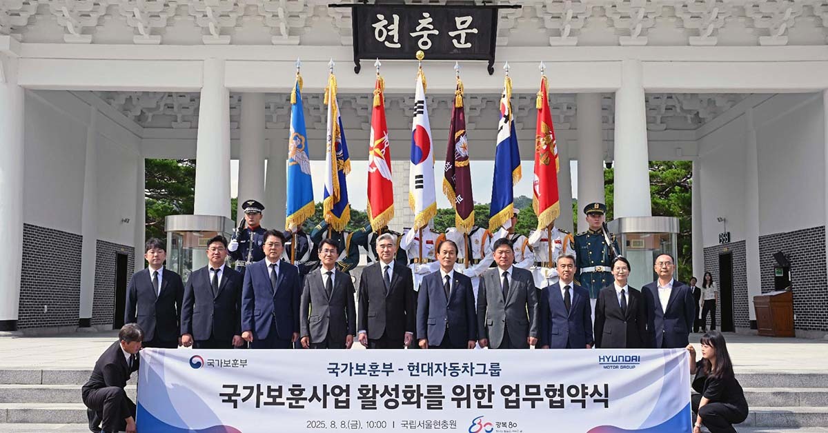 현대차그룹은 8일 국립서울현충원에서 국가보훈부와 ‘국가보훈 사업 활성화를 위한 업무협약’을 체결하고, 실질적인 차량 및 기술 지원에 들어간다고 밝혔다. 협약식에는 성 김 현대차그룹 전략기획담당 사장과 김동욱 전략기획실장 부사장, 권오을 국가보훈부 장관 등 주요 관계자가 참석했다.