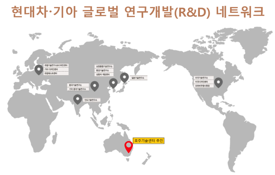 호주 연구소가 설립되면 오세아니아 지역 첫 R&D 거점으로, 글로벌 네트워크 확장과 현지화 연구 강화가 동시에 가능할 것으로 예상된다. 현대차그룹의 글로벌 소프트웨어센터 포티투닷(FortytwoDot)의 R&D 거점도 호주에 위치하고 있어 시너지 효과도 기대된다.