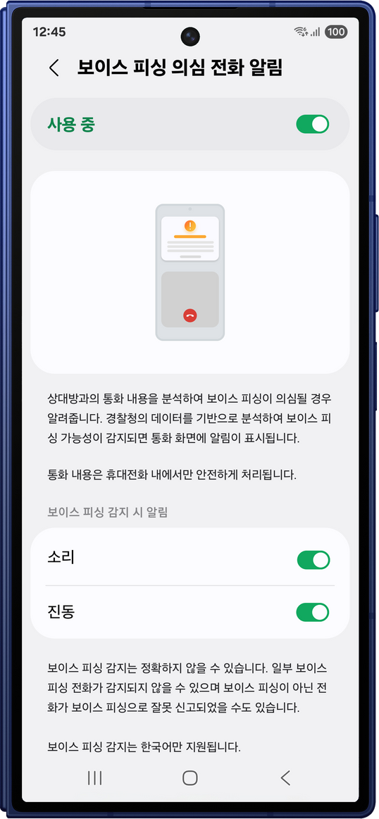 갤럭시 스마트폰은 통화 내용을 토대로 보이스피싱이 의심되면 '의심', '경고' 알림을 통화 중에 사용자에게 보낸다.