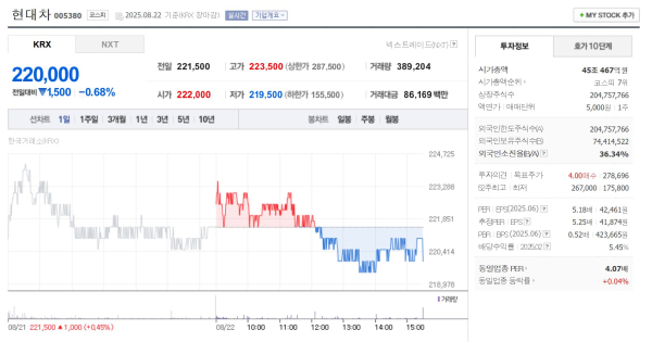 22일 현대차는 222,000원에 장을 시작해 장중 223,500원까지 올랐으며, 저가는 219,500원을 기록했다. 총 거래량은 약 38만 9,204주로 집계됐다.
