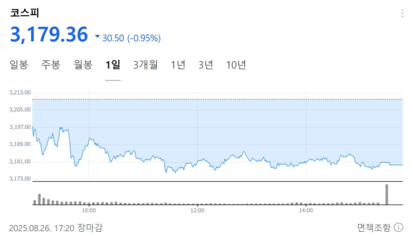 [잡포스트] 이숙희 기자 = 26일 코스피는 전일 대비 30.50포인트(–0.95%) 하락한 3,179.36에 장을 마감했다.