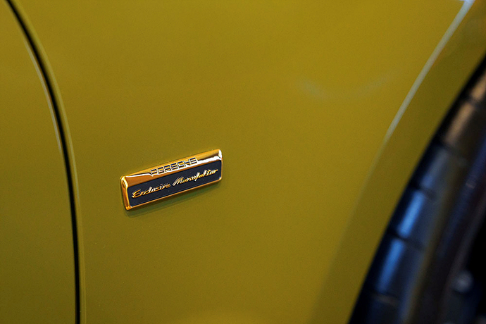 인테리어는 블랙과 올리브 네오 컬러가 어우러진 파샤 패턴 시트가 특징이다. 또한, 1963년 최초의 911에 적용된 디자인과 동일한 포르쉐 크레스트, 골드 컬러의 익스클루시브 매뉴팩처 배지와 헤리티지 배지가 부착됐다.