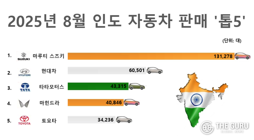 1위는 13만1278대를 판매한 마루티스즈키(점유율 약 46%)가 차지했다. 현대차에 이어 △타타모터스(4만3315대·10.5%) △마힌드라(4만846대, 10.0%) △토요타는 3만4236대(8.7%) 순으로 이어졌다.