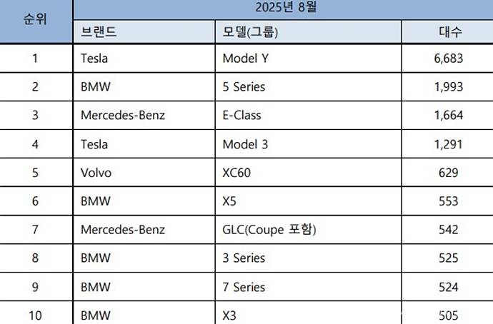 8월 베스트셀링 모델은 테슬라 모델 Y(4,805대)가 압도적인 1위를 차지했으며, 모델 Y 롱 레인지(1,878대), 모델 3(1,290대)가 뒤를 이어 테슬라가 판매 상위권을 석권했다.