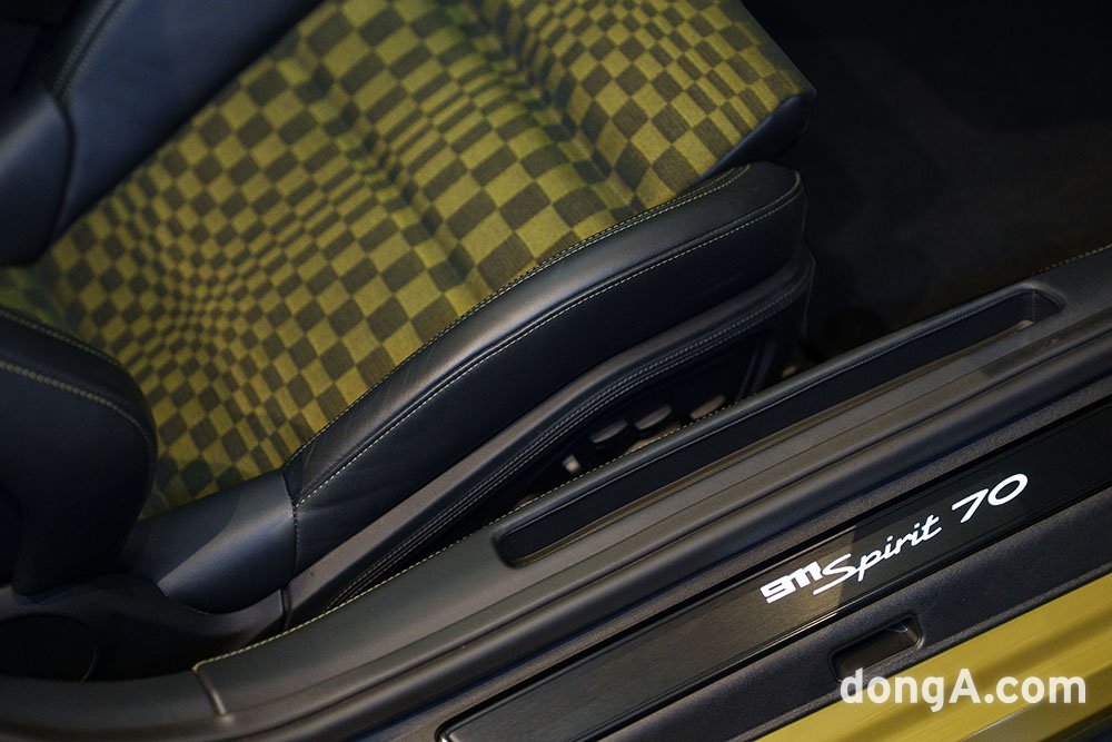 무엇보다 시선을 사로잡는 것은 외관이다. 깊은 메탈릭 톤이 감도는 전용 색상 ‘올리브 네오’는 포르쉐 디자이너와 도장 전문가들이 개발해냈다. 레트로하면서도 절제된 고급스러움을 표현하는 것이 특징이다. 여기에 클래식한 ‘훅스’ 디자인의 휠, ‘70’ 숫자가 강렬히 새겨진 도어 그래픽, 골드톤 브론자이트 디테일이 어우러져 70년대 포르쉐 영광을 그대로 담아낸다. 인테리어 역시 과거를 오마주한다. 올리브 네오와 블랙 컬러가 조화를 이루는 ‘파샤’ 패브릭 패턴은 정사각형과 직사각형이 어지럽게 배열된 그래픽으로, 마치 70년대 패션과 음악의 자유분방함을 시트에 담은 듯한 인상을 준다.