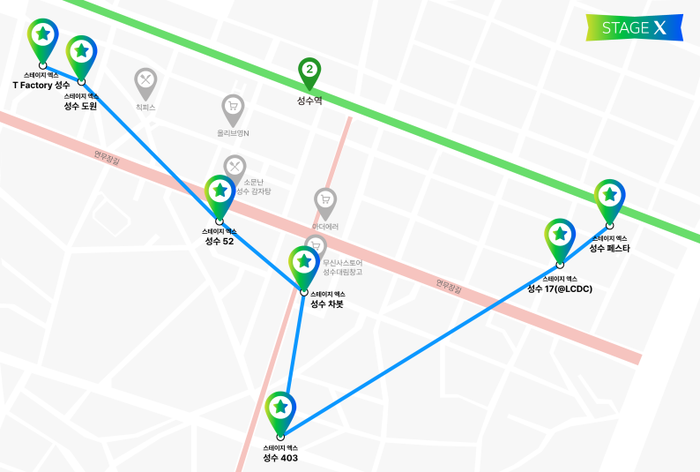 스테이지 엑스는 론칭 1년 만에 총 8개 거점을 마련하며 빠른 성장을 이어가고 있다. 기존 1·2호점인 '스테이지 엑스 성수 도원'과 '스테이지 엑스 익선'은 가동률이 전년 대비 약 2배 증가했으며, 올해 새롭게 문을 연 '성수 403', 'T Factory 성수', '성수 차봇', '성수 52', '성수 페스타', '성수 17(@LCDC)' 역시 유동 인구가 많은 주요 구역에 자리하고 있다.