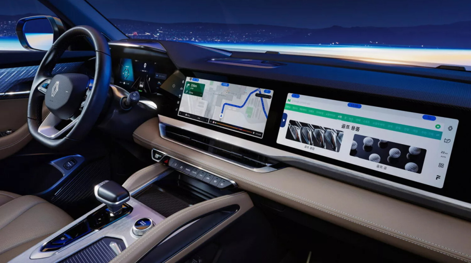 실내 디자인은 굉장히 고급스럽습니다 동급 대비 최초로 동승석 디스플레이가 탑재된 오픈R 파노라마 스크린이 들어가는데 계기판부터 동승석까지 3개의 12.3인치 대형 디스플레이가 들어가는데요 특히 동승석에서는 유튜브 시청이나 뉴스, SNS 등 다양한 엔터테인먼트 기능과 스마트폰을 게임 패드로 총 20개 이상의 R:아케이드 게임도 즐길 수 있죠