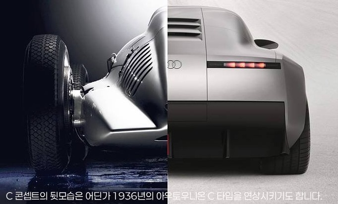 한편 C-콘셉트의 뒷모습은 아우디의 전신이었던 ‘아우토우니온’이 1936년에 제작한 레이싱 머신 ‘C-type’의 뒷모습이 연상되기도 합니다. 물론 이들 두 차량은 형태 구성은 상당히 다르지만, 지붕에서 어깨로 이어지는 계단 형식의 조형과 차체 뒷부분에 환기구가 만들어진 점에서 일견 비슷한 구성으로 보입니다.