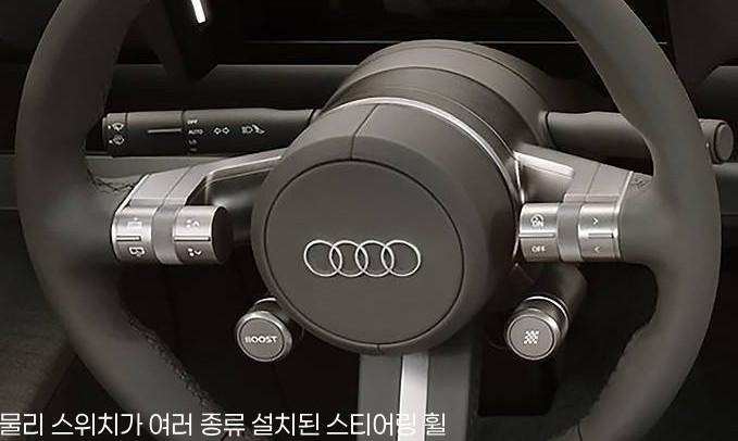이러한 원기둥이나 원형의 조형 이미지는 스티어링 휠의 에어백 커버와 버튼, 그리고 양쪽 스포크의 금속 질감 원기둥 형태의 물리적 스위치에서도 반복됩니다. 이런 기하학적 둥근 형태의 조형은 아우디 브랜드 심벌의 네 개의 원형에서부터 시작된 디자인 테마로 보입니다.