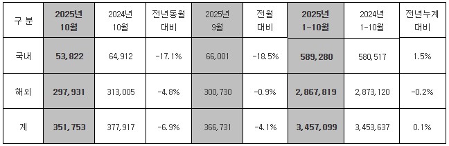 현대자동차가 2025년 10월 전 세계 시장에서 총 35만 1,753대를 판매하며 전년 동월 대비 6.9% 감소한 실적을 기록했다. 국내 시장에서는 5만 3,822대를, 해외 시장에서는 29만 7,931대를 판매했다.