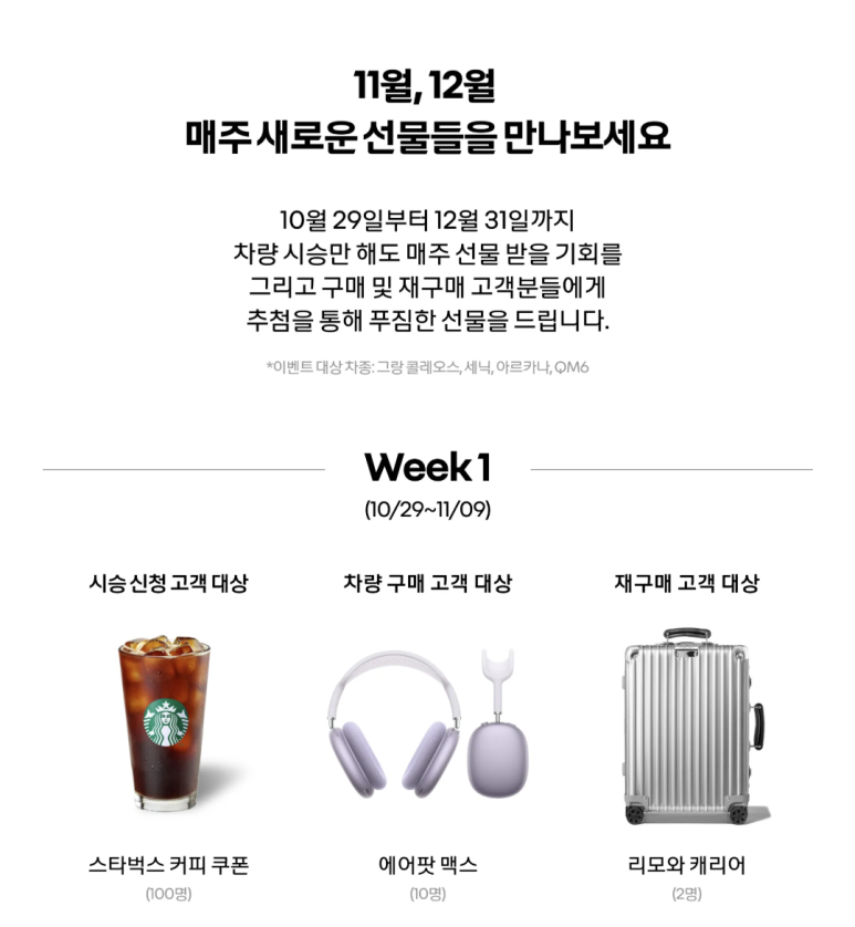 이번 11월 프로모션의 주인공은 단연 QM6입니다. '가성비의 왕'이라는 별명에 걸맞게 모든 혜택을 집중시킨 모습입니다.