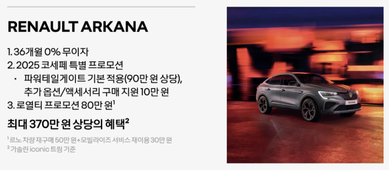 특히 QM6의 최대 520만 원 혜택과 아르카나의 36개월 무이자 할부는 4분기 구매를 망설일 이유가 없게 만드는 강력한 조건입니다.