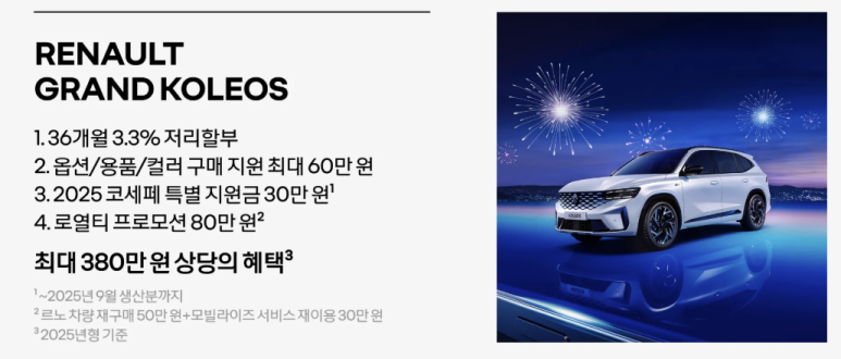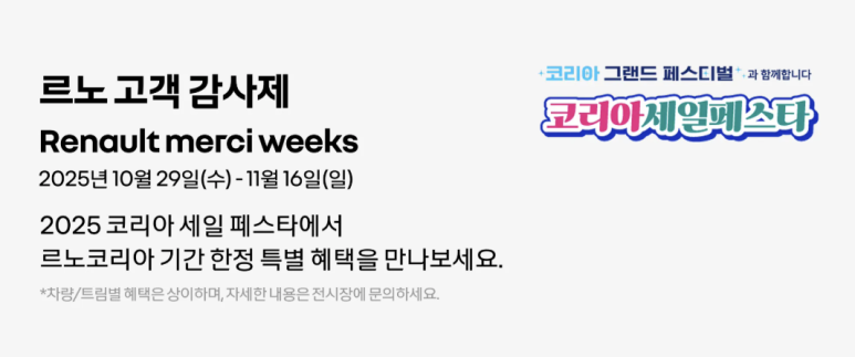 2025년 11월 3일 현시간 기준, 르노코리아의 프로모션은 '코리아 세일 페스타'와 맞물려 역대급 할인율을 보여주고 있습니다.