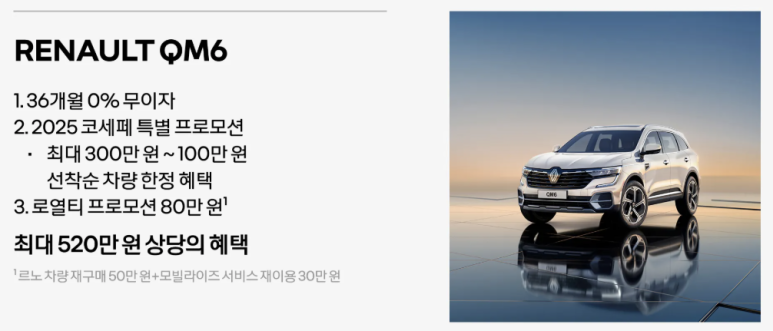 이 모든 혜택을 중복 적용할 경우, QM6는 최대 520만 원이라는 압도적인 혜택으로 구매가 가능합니다.