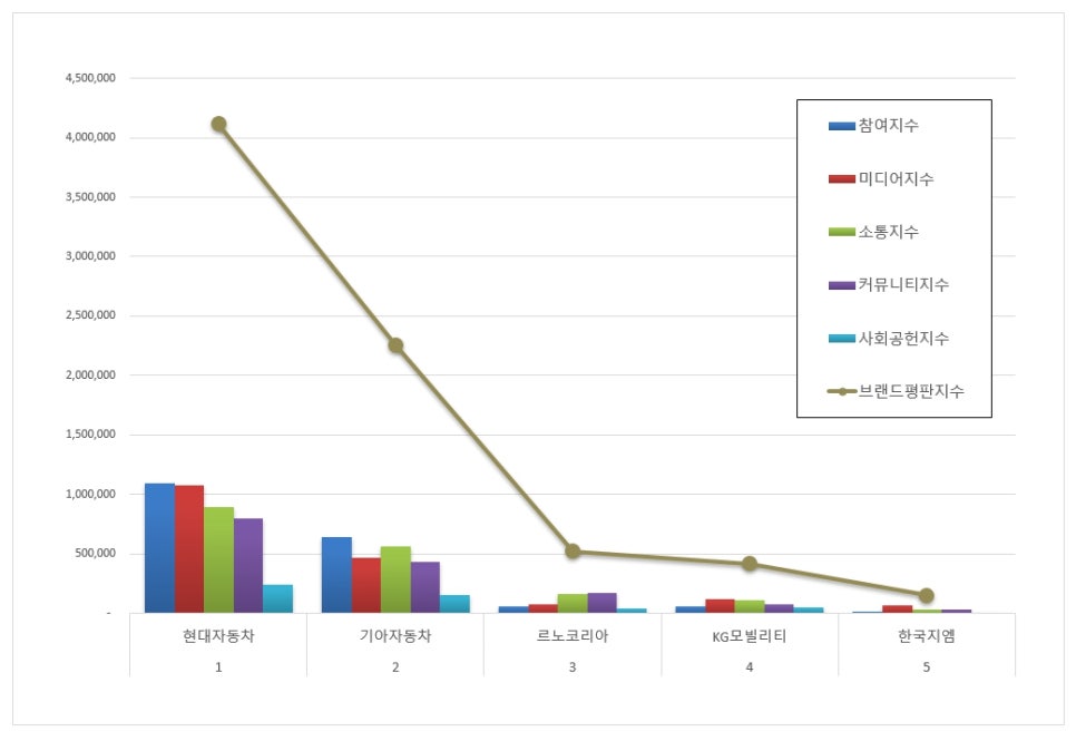 국산 자동차 기업 브랜드평판 1위를 기록한 현대자동차 브랜드는 참여지수 1,095,746 미디어지수 1,073,720 소통지수 897,329 커뮤니티지수 802,718 사회공헌지수 245,436이 되면서 브랜드평판지수 4,114,948로 분석됐다. 지난 10월 브랜드평판지수 4,772,470과 비교해보면 13.78% 하락했다.