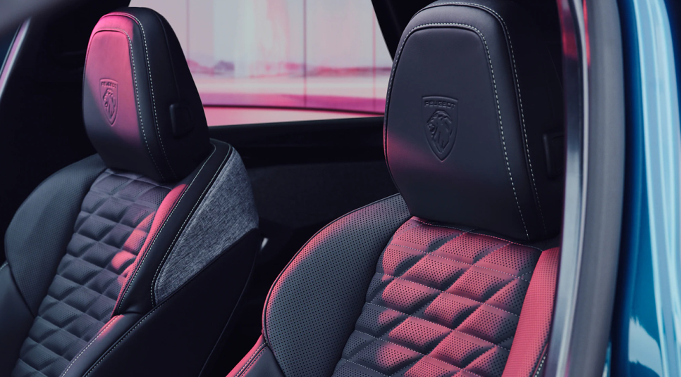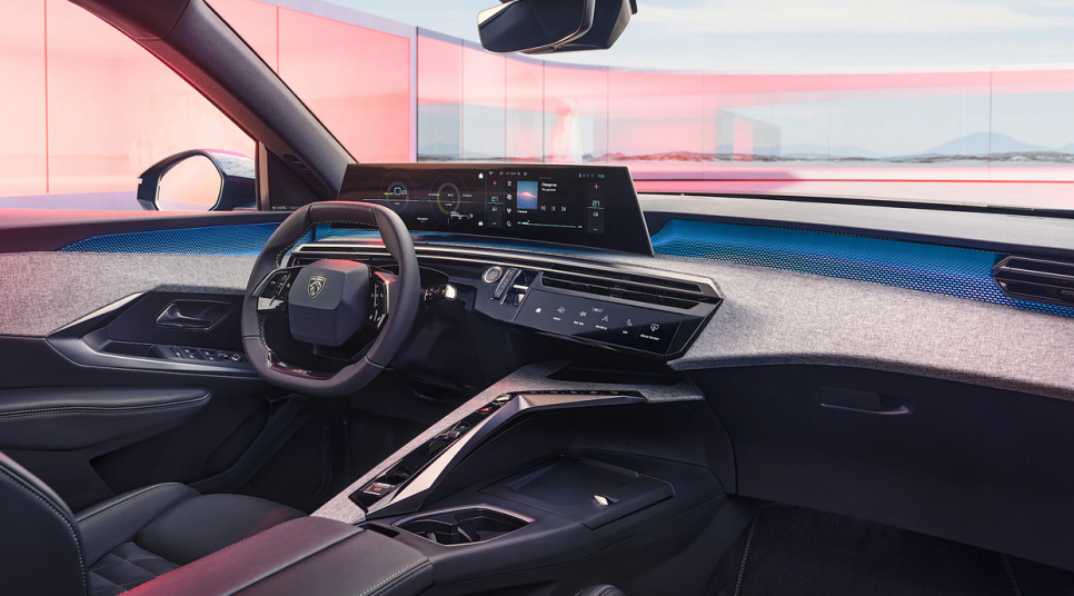 푸조 실내는 굉장히 세련되면서도 현대적인데요. 최고의 그립감을 선사하는 I-콕핏 스티어링 휠은 위아래 없는 플랫 구조로 되어 있고 21인치 파노라믹 커브드 디스플레이 또한 공중에 떠있는 듯한 플로팅 타입으로 미래지향적인 분위기를 더했습니다 그리고 도어 패널과 대시보드 라인 등 전체적으로 수평형 레이아웃을 갖추면서 뛰어난 시인성을 제공하죠. 특히 오목하게 들어가 있는 앰비언트 라이트는 깊이감을 주면서도 독특한 분위기를 선사합니다.