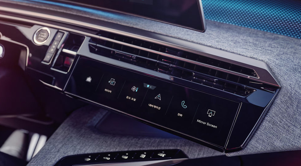 아래쪽에는 터치식 버추얼 I-토글 버튼이 눈에 띄는데요 온도 조절부터 미디어, 내비게이션, 전화 등 자주 사용하는 10개 기능을 즐겨찾기 방식으로 설정할 수 있죠 그리고 센터 콘솔에는 드라이브 모드, 볼륨 및 자주 사용되는 몇 가지 기능들은 물리 버튼으로 되어 있어 주행하면서도 손쉽게 조작할 수 있습니다. 대시보드, 도어, 센터 콘솔을 보면 부분적으로 직물 소재를 사용해 고급스러운 분위기까지 더해주네요(GT 트림 기준)
