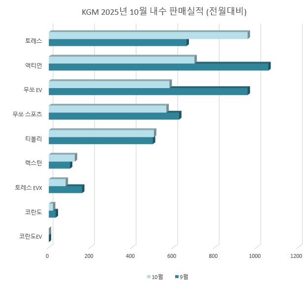 KGM은 10월 9,517대를 판매했다. 내수 3,537대, 수출 5,980대 구성이다. 내수는 13% 감소했지만 수출이 26% 늘며 전체 판매는 전년 동월 대비 2.9% 증가했다. 무쏘 EV와 토레스 하이브리드가 해외에서 좋은 반응을 얻으며 유럽과 중동 시장 수출이 회복세를 보였다.