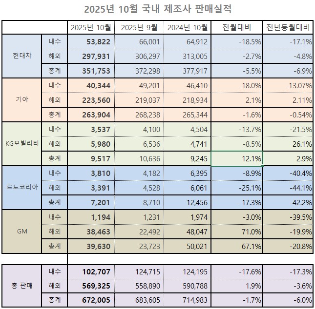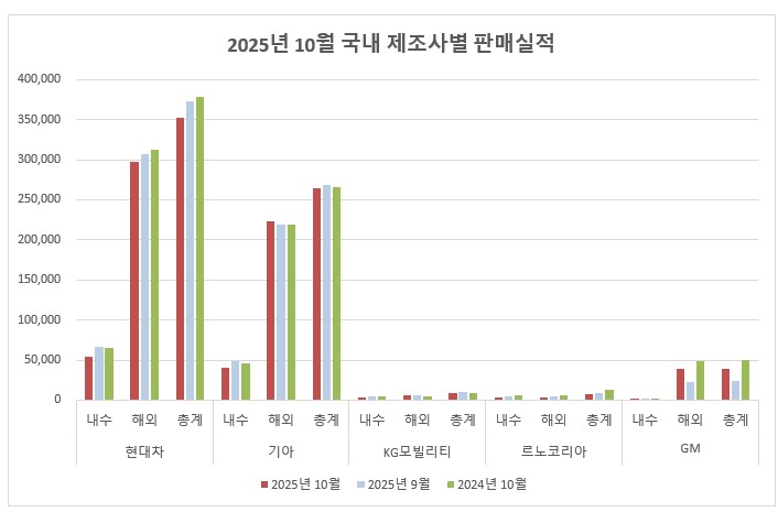 10월 완성차 5사의 총판매는 69만 6천여 대로 집계됐다. 현대차는 총 35만 1,753대, 기아는 26만 3,904대를 판매했다. KGM은 9,517대로 소폭 상승했고, 르노코리아는 7,201대로 감소했다. 내수는 전체적으로 10% 이상 줄었고, 수출은 일부 브랜드 중심으로 완만한 회복세를 보였다.