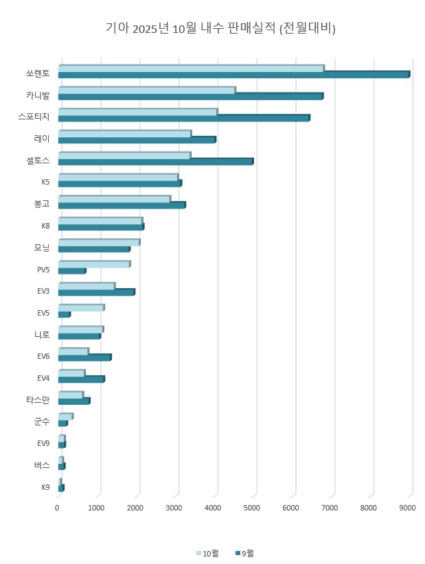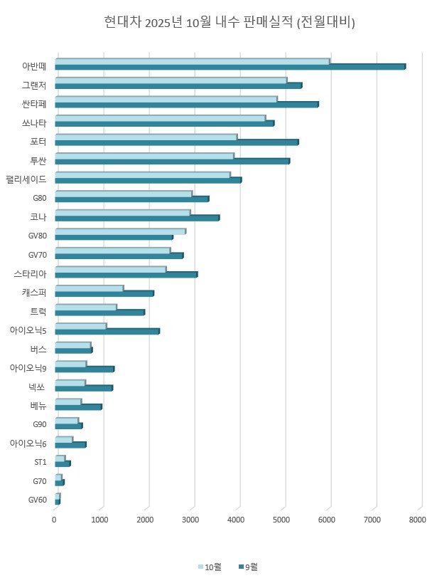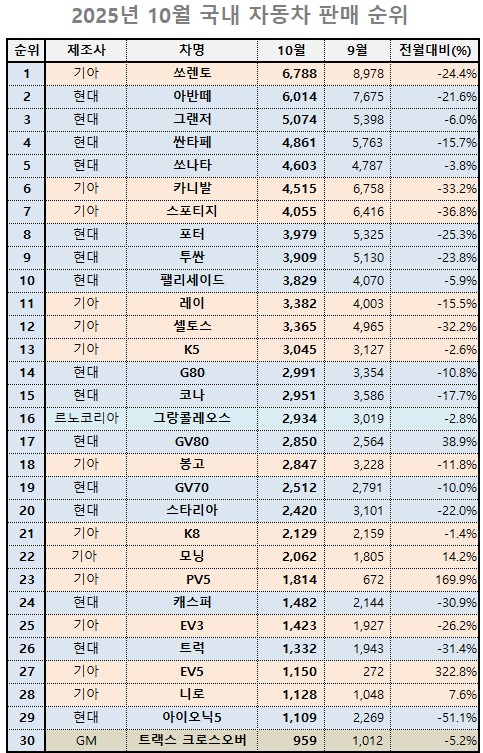 국내 시장 상위 10개 모델은 여전히 현대·기아가 독식했다. 쏘렌토가 6,788대로 1위를 기록했고, 아반떼 6,014대, 그랜저 5,074대, 싼타페 4,861대가 뒤를 이었다. 중형 SUV와 세단의 비중이 전체 상위권의 80%를 차지했다. 카니발과 스포티지, 포터, 투싼, 팰리세이드까지 10위권이 모두 두 브랜드 제품으로 채워졌다. SUV 중심의 소비 흐름은 여전했으나, 전반적으로 9월 대비 평균 20% 이상 판매가 감소하며 소비심리 둔화가 뚜렷했다.
