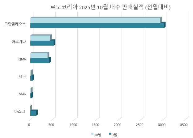 르노코리아의 10월 판매는 총 7,201대로 전월 대비 17%, 전년 동월 대비 42% 감소했다. 내수는 3,810대, 수출은 3,391대였다. 전체 판매 중 하이브리드 모델 비중이 66%를 넘으며 제품 구조가 빠르게 전동화 중심으로 재편되고 있다.
