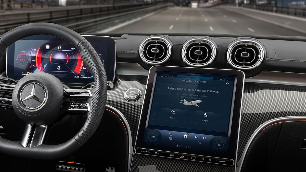이번 업데이트에는 메르세데스-벤츠 R&D 코리아 센터가 국내 완성차 업계 최초로 개발한 ‘인천국제공항 실시간 항공 정보 서비스’가 포함됐다. 해당 기능은 티맵 오토 내비게이션이 설치된 차량에서 이용 가능하며, 운전자가 차량 내 센터 디스플레이에서 터미널(T1, T2)을 선택하면 항공사, 편명, 목적지, 출발 및 도착 예정 시각 등을 한눈에 확인할 수 있다.
