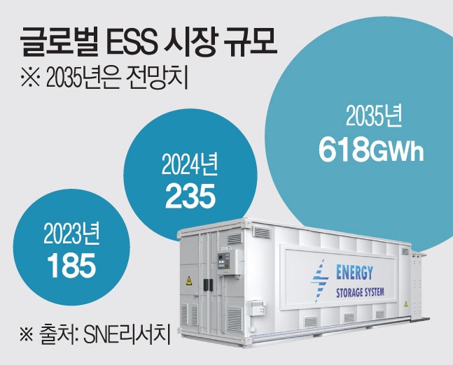 5일 시장조사업체 SNE리서치에 따르면 전 세계 ESS 판매 실적은 지난해 235GWh(기가와트시)에서 2035년 618GWh로 3배 가까이 늘어날 전망이다. ESS는 전력을 저장했다가 필요할 때 꺼내 쓰는 설비다. 태양광, 풍력 등 신재생에너지의 간헐성을 보완해주는 인프라로 활용된다.