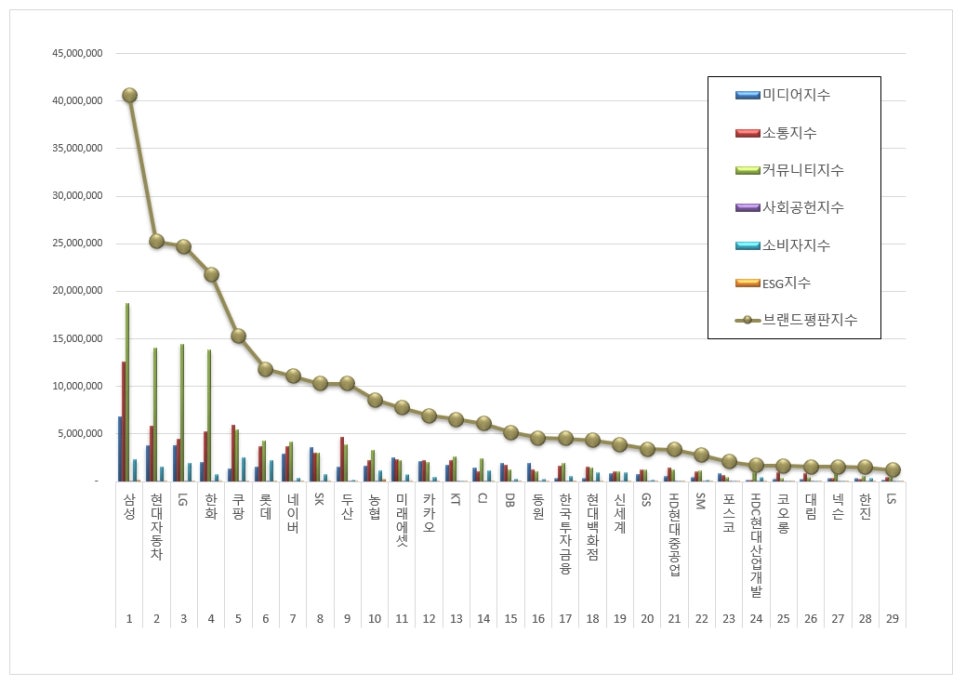 한국기업평판연구소는 2025년 10월 6일부터 2025년 11월 6일까지의 66개 대기업집단 브랜드 빅데이터 268,270,830개를 분석하여 대기업집단의 미디어, 소통, 커뮤니티, 사회공헌, 소비자지수, ESG를 기반으로 브랜드평판지수를 측정했다. 지난 10월 브랜드 빅데이터 156,401,152개와 비교하면 71.53% 증가한 수치다.