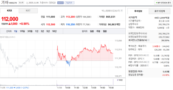 기아차 주가 11월 6일 112,000원 강보합세 마감