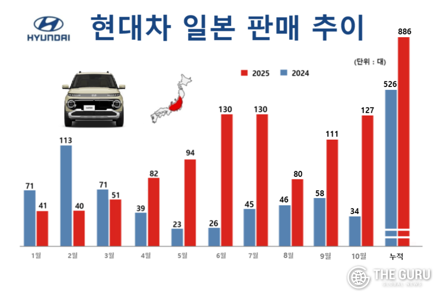 [더구루=김예지 기자] 현대자동차가 일본 시장에서 가파른 성장세를 이어가고 있다. ‘수입차 무덤’으로 불리는 일본 승용차 시장에서 소형 전기 SUV ‘인스터(국내명 캐스퍼 일렉트릭)’ 흥행으로 지난달 판매량이 전년 동기 대비 3.7배 증가했다.