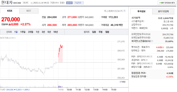 시가는 266,500원에 형성되었으며, 현재까지 265,000원에서 271,000원 사이의 가격을 기록했다. 현대차의 거래량은 172,293주이며, 현재까지의 거래대금은 463억 1,900만 원으로 집계되었다.