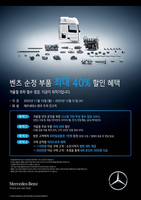 "트럭 운전자 긴급 공지!" 메르세데스-벤츠 트럭, 최대 40% 할인 ‘겨울맞이 서비스 캠페인’ 시작