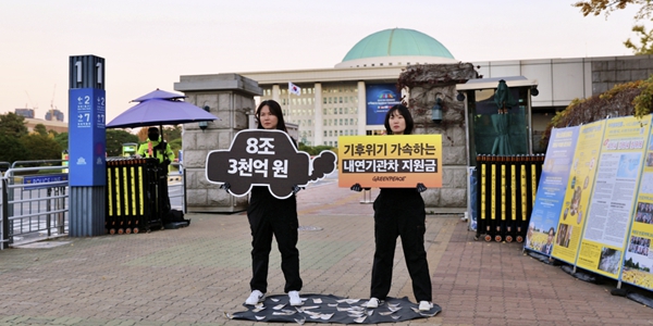 그린피스 활동가들이 국회 앞에서 내연기관차 지원금 지급 중단을 촉구하는 팻말을 들고 시위를 하고 있다. 「그린피스」