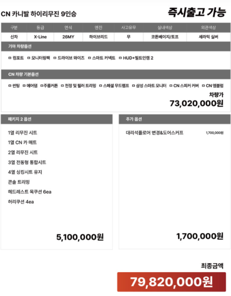 2025년 마지막 할인 프로모션은 최대 1,000만 원 할인 혜택과 함께 프로모션에 참여하신 분들께는 차액을 보상하는 할인 보상 제도까지 지원합니다 프로모션 차량은 미리 준비되어 있기 때문에 계약 후 즉시 출고까지 가능한데요 단 선착순 30대 한정으로 진행되고 있죠. CN 카니발 하이리무진 하이브리드 9인승은 기본 옵션과 추가 옵션에 따라 가격 차이가 심하게 나는데요 보통 7천만 원 중반부터 9천 초반대로 가격이 형성되어 있습니다. 자세한 가격은 CN모터스 홈페이지를 참고해 주시면 됩니다.