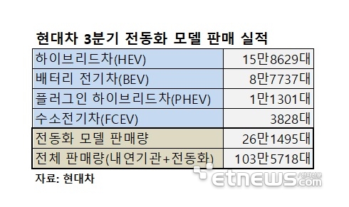 3분기 현대차 전동화 모델별 글로벌 판매량은 하이브리드차(HEV)가 전년 동기 대비 32% 증가한 15만8629대로 가장 많았다. 이어 배터리 전기차(BEV)가 47% 늘어난 8만7737대, 플러그인 하이브리드차(PHEV)가 26% 증가한 1만1301대를 기록했다. 수소전기차(FCEV)는 신형 넥쏘 출시 효과에 힘입어 161% 급증한 3828대가 판매됐다.