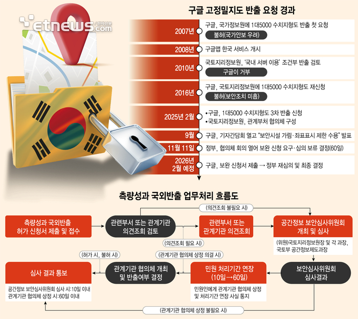 정부가 구글의 고정밀지도(1대5000 국가기본도) 반출 신청을 즉각 불허하지 않고 '보류'로 결정한 배경엔 복합적인 계산이 깔려 있다. 형식은 '보완 요구'지만, 내용은 안보 원칙과 통상·외교 리스크 사이에서 절충점을 찾은 결과다.