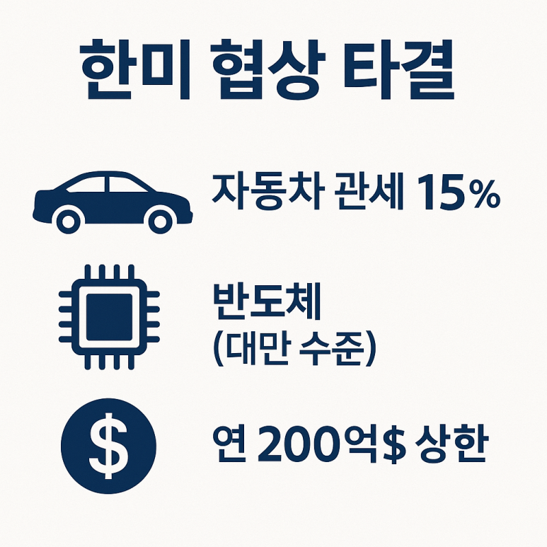 반도체와 농산물: 반도체는 우리 경쟁국인 대만보다 불리하지 않은 수준으로 관세를 적용하기로 했고, 농산물 시장 추가 개방은 막아냈다고 해요.