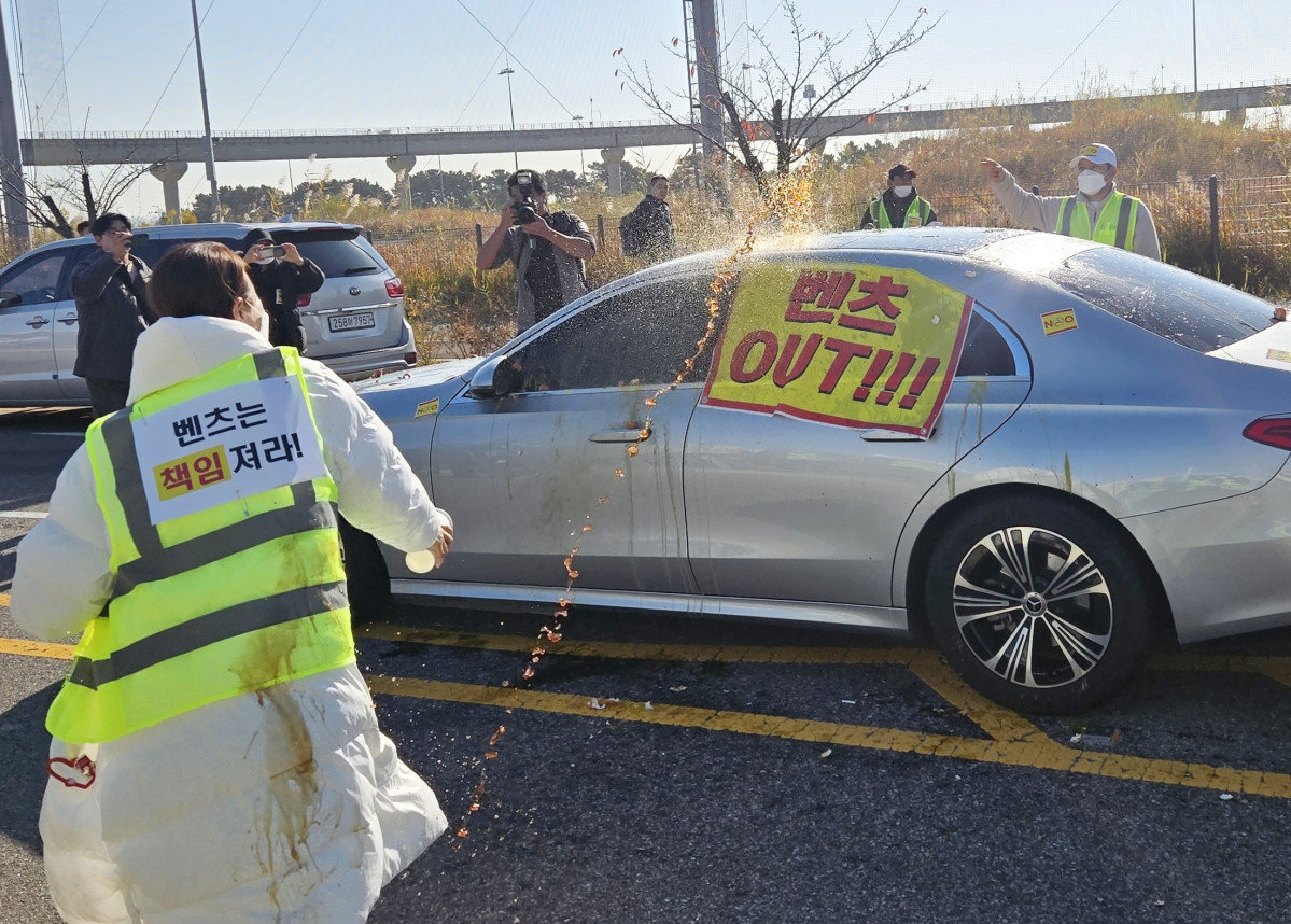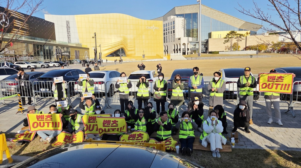 17일 완성차 업계에 따르면 인천 청라 한 아파트 입주민 40여 명은 14일 중구 영종도에서 열린 ‘메르세데스-벤츠 미래 전략 컨퍼런스’ 행사장 앞에서 시위를 벌였다. 당시 입구에는 ‘책임 회피 말고 피해 보상하라’, ‘카메라 앞에서는 명품, 피해자 앞에서는 불량품’ 등의 현수막이 걸렸다. 이날 집회가 트럭과 현수막, 확성기 등을 활용해 이뤄지자 집회 신고를 받은 경찰도 순찰을 돌며 긴장감이 조성됐다. 이들은 계란과 밀가루를 벤츠 차량인 E클래스에 던지기도 했다.