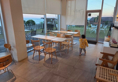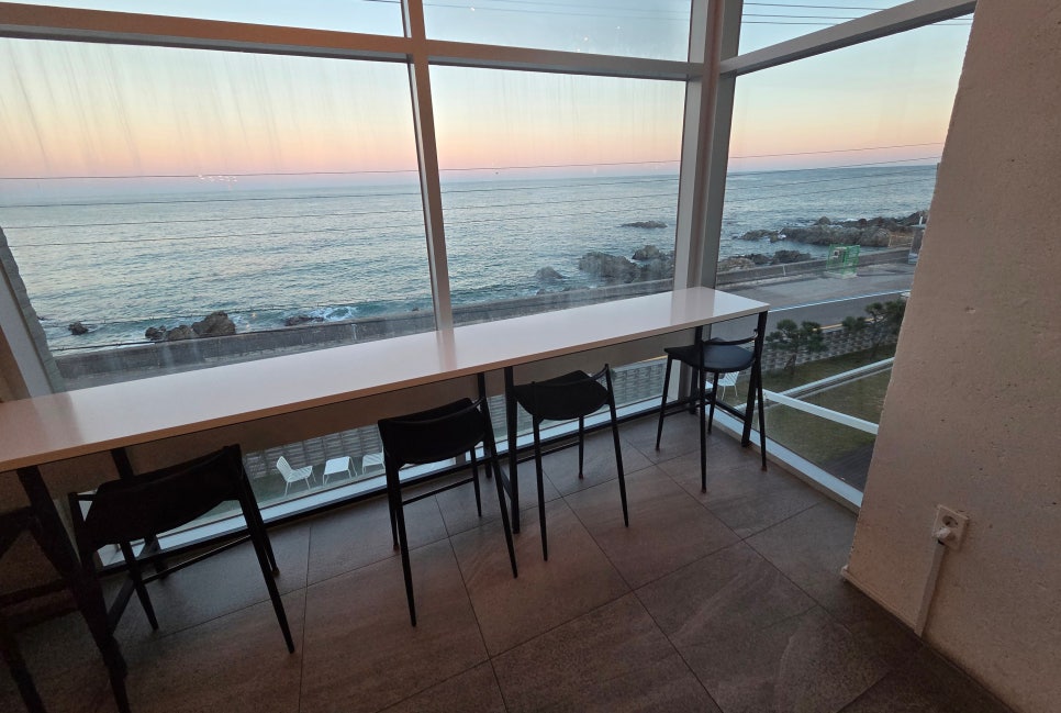 통유리 구조로 창가 쪽은 바다 뷰를 제대로 즐길 수 있습니다. 2층에는 야외 테라스처럼 되어 있는 곳이 있고 큰 소파에서 편안히 누워 경치를 보시면서 음료를 드실 수 있죠 그런데 관리가 잘 안되는 것 같아요 조금 지저분한 느낌이 있네요. 전체적으로 분위기 있는 카페이지만 조금 협소한 부분이 없지 않아 있습니다. 대가족 또는 6인 이상 친구분들끼리 오시면 2층 큰 탁자 또는 3층을 이용하시면 될 것 같아요.