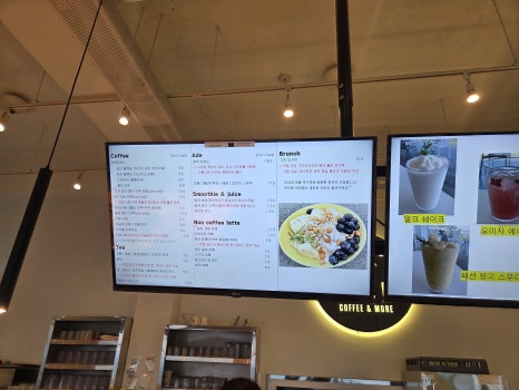카페 1층 내부는 이런 식으로 되어 있습니다 밖으로 야외 테라스도 연결되어 있지만 추워서 못 나가봤어요. 카운터 쪽에는 디저트가 마련되어 있는데요 쌀 카스테라, 맘모스빵, 마늘빵, 초코 쿠키 등 다양하게 준비되어 있었습니다 가격대는 5~7천 원 정도로 판매되고 있어요. 커피/음료 종류도 다양하게 있는데 가격대는 조금 있네요.