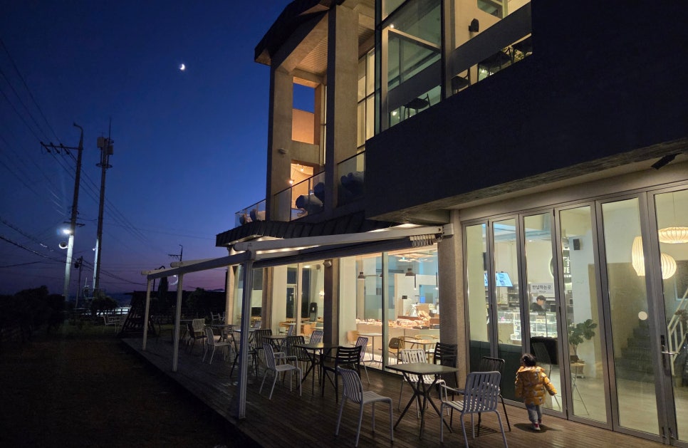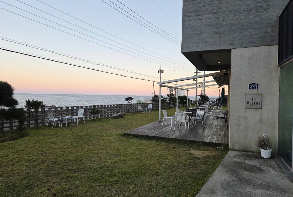 평일 오후 5시쯤 도착한 것 같은데 해도 뉘엿뉘엿 지고 있어서 그런지 바다가 더 이쁘더라고요 주말에도 한 번씩 바다 보러 영덕 가는데 그때마다 무브온 카페를 가려고 하면 차량이 많이 있더라고요 그만큼 많이 찾는 장소이기도 합니다. 방문자 리뷰도 많고 리뷰평도 좋은편이죠 건물도 이쁘고 야외 테라스, 야간 뷰 등 전체적인 분위기는 아주 만족스러운곳이죠.