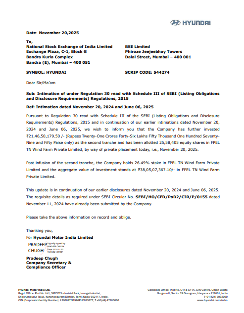 21일 HMIL이 인도증권거래소에 제출한 공시 따르면, HMIL은 FPEL TN 풍력발전소에 21억 루피(약 356억원)를 추가 투자하면서 255만8000주의 보통주를 사모 방식으로 배정받았다. 현대차는 지난 6월 1차 1.6억 루피(약 30억원)을 투자한 바 있다. 이번 2차 투자를 통해 누적 지분율은 26.49%로 확대됐다.