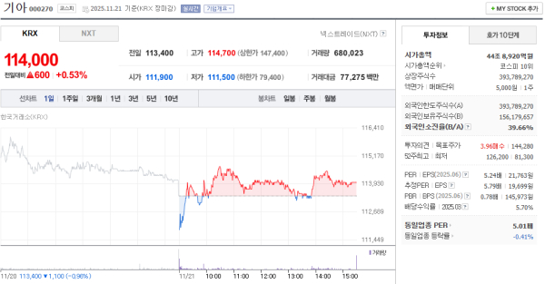 기아자동차 주가 11월 21일 114,000원 강보합세 마감