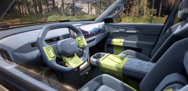 이외에도 EV5 위크엔더 콘셉트는 외관보다 실내 디자인 변화 폭이 더 큽니다. 가장 먼저 대형 디스플레이가 조수석 전면까지 길게 확장되면서 미래적인 분위기를 강조합니다. 기아는 최근 디지털 UX 트렌드를 따라가면서도 EV5 특유의 패밀리 SUV 감성을 유지했습니다.
