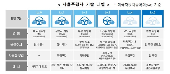 한국의 자율주행차 기술 수준은 미국자동차공학회(SAE) 기준 조건부 자동화 단계인 레벨3로 평가받는다. 반면, 미국과 중국은 비상시에만 운전자가 개입하는 고도 자동화 레벨4 수준에 올랐다.