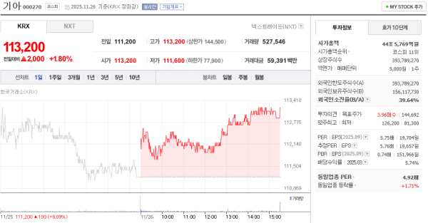 기아자동차 주가 11월 26일 113,200원…1.80% 상승 마감